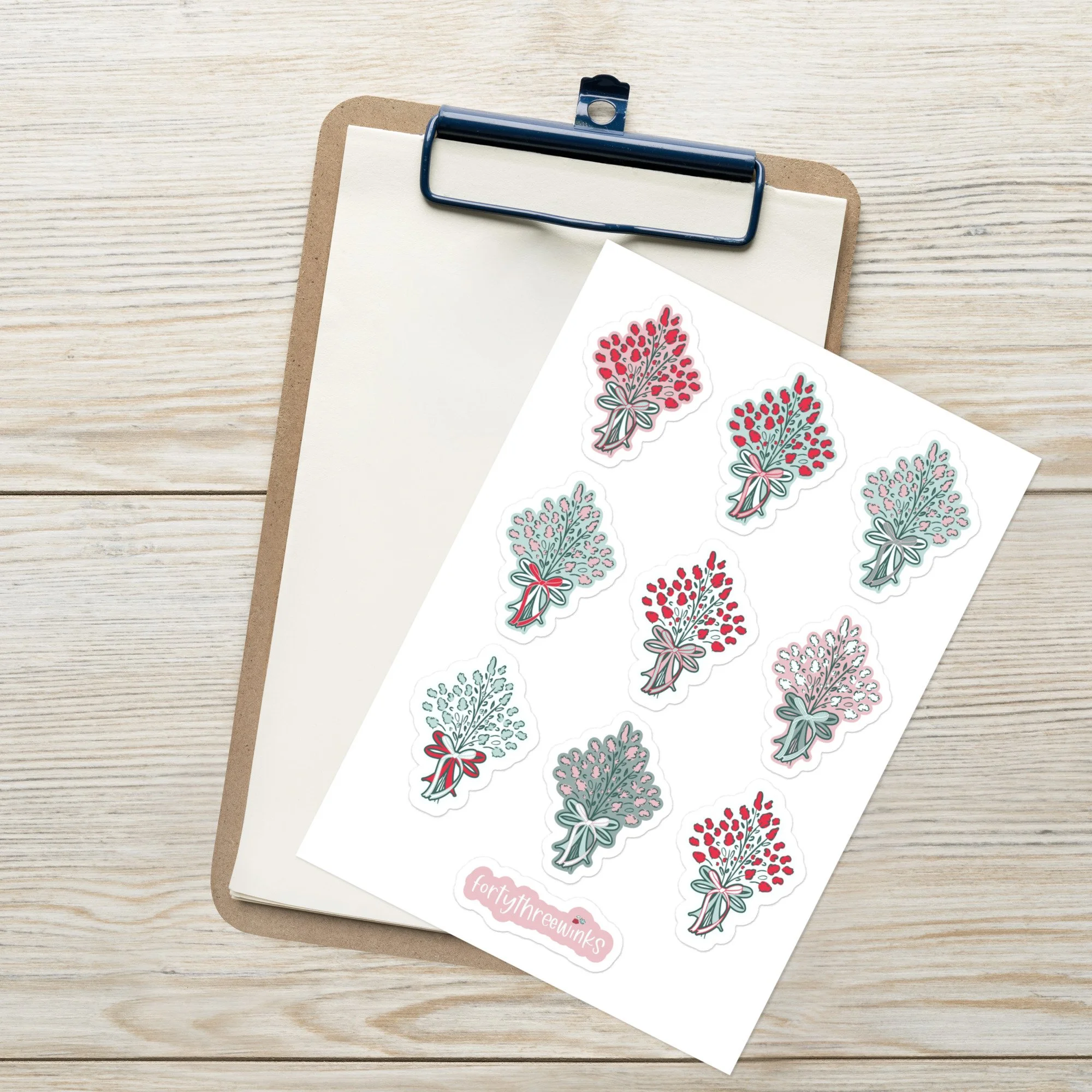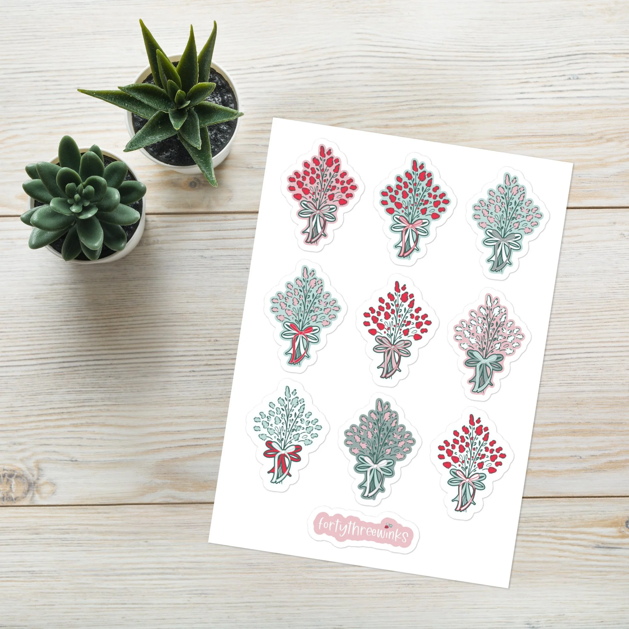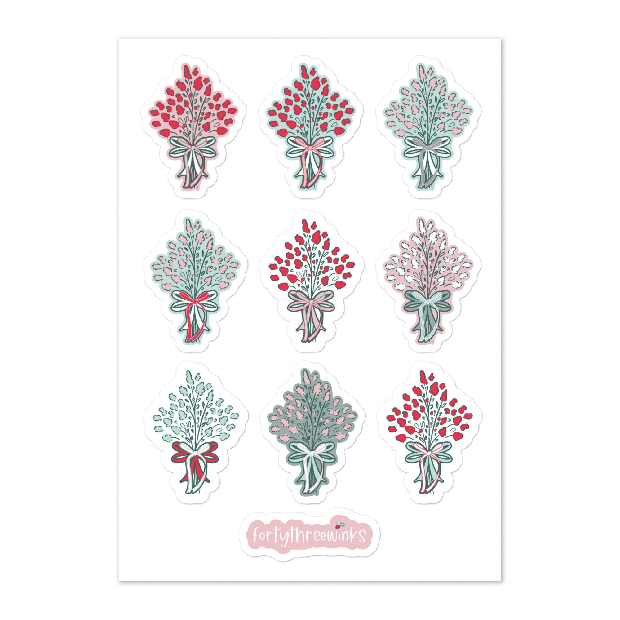 Nine (9) friendly bouquet stickers are included with this sticker sheet. Each sticker — in cheerful colors of pinks and greens — measures ~ 1.5 inches wide x 2 inches high.
